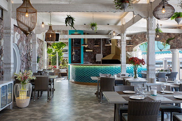 該紅網餐廳位于索契黑海沿岸是以鄉村風格為主題打造。公共服務臺被幾百片藍色小魚鱗所包圍,配以淡黃色的暗藏燈光,讓整個空間顯的格外的融洽。值得我們注意的是白色做舊柱子,每根柱子都互相連接并固定和支撐起來了所有頂棚承重,矩形柱體上的花紋是本地獨有的特色文化。餐廳四周是由碎拼文化石組成的墻面,該種材料在施工時須要凌亂錯綜復雜,排列時也不那么遵循規律性,而就是這種方式卻能快速把人帶進大自然的懷抱中。